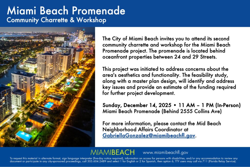 To encourage greater neighborhood participation, the City of Miami Beach is hosting it’s second community charrette and workshop on the Miami Beach Promenade. Participants will receive an update on the project’s current status, be presented with potential design approaches and have the opportunity to provide feedback on various elements of the presentation.