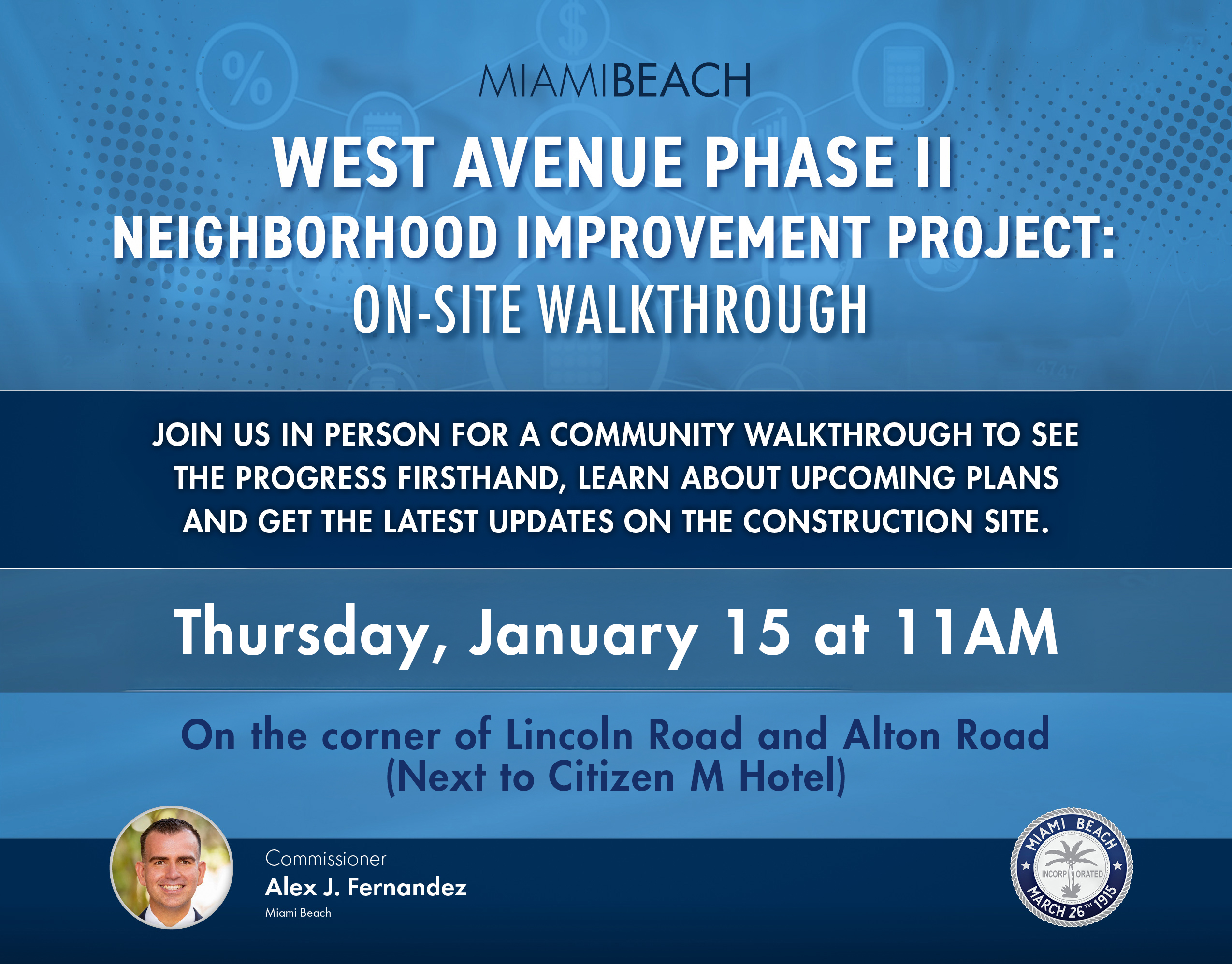 Join Commissioner Alex J. Fernandez in person for a community walkthrough to see the West Avenue Phase II Neighborhood Improvement Project progress firsthand, learn about upcoming plans and get the latest updates on the construction site.