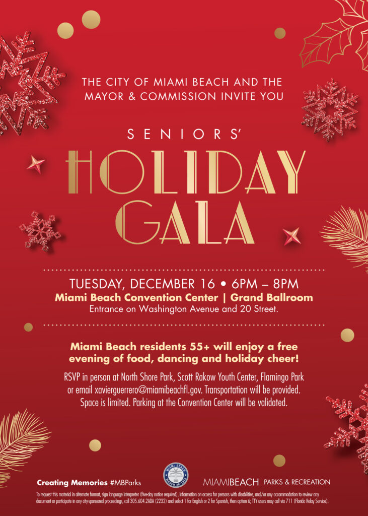 Nuestro Departamento de Parques y Recreación de Miami Beach invita a todas las personas mayores de 55 años a nuestra Gala Anual de Fiestas para Personas Mayores. ¡Disfruten de una noche de comida, baile y mucha diversión! Este evento es gratuito y se proporcionará transporte. El cupo es limitado y se requiere confirmar asistencia para ingresar. Puede confirmar asistencia en persona en Flamingo Park, Scott Rakow Youth Center o North Shore Park Youth Center, o por correo electrónico. XavierGuerrero@miamibeachfl.gov a partir del 1 de diciembrecalle.