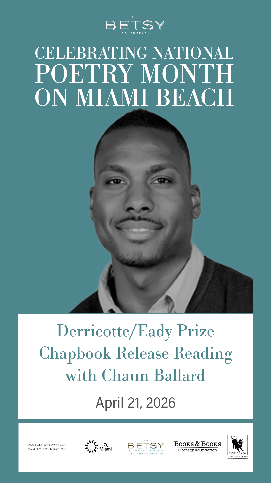 Abr 21 19:00 horas - 21:00 horas Derricotte/Eady Prize Chapbook Release Reading with Chaun Ballard La Betsy South Beach 1440 Ocean Drive, Miami Beach Detalles del Evento Obtener direcciones