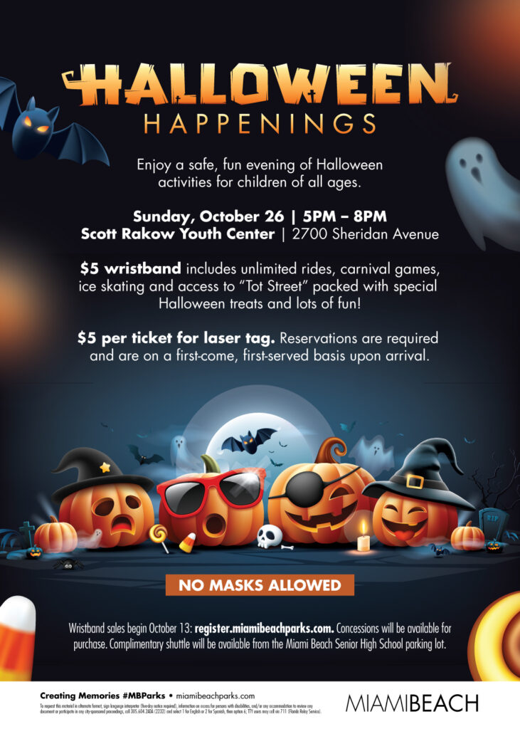 Come enjoy a safe, fun evening of Halloween Activities. The event features carnival games, rides, and Treats for Tots experience for toddlers and young children. Lasertag reservations for ages 10+ will be required on a first-come, first-served basis upon arrival at the event; space is limited. Complimentary shuttle parking will be available from the Miami Beach Senior High School parking lot. Wristbands include unlimited rides and games, and entrance to Treats for Tots. Each laser tag game is $5. Concessions will be available for purchase. Wristbands can be purchased beginning October 13th by visiting register.miamibeachparks.com.