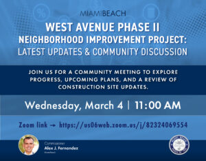 Join Commissioner Alex J. Fernandez for a community meeting to explore progress, upcoming plans and a review of construction site updates for the West Avenue Phase II Neighborhood Improvement Project.