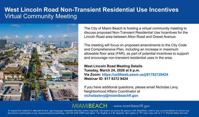 The City of Miami Beach is hosting a virtual community meeting to discuss proposed Non-Transient Residential Use Incentives for the Lincoln Road area between Alton Road and Drexel Avenue.