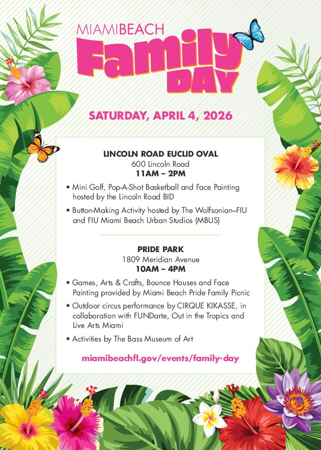 April 4 @ 11:00 am - 4:00 pm Miami Beach Family Day 2026 Euclid Oval 660 Lincoln Road, Miami Beach, FL, United States +1 more Miami Beach invites residents and visitors to celebrate the city’s vibrant cultural and artistic scene on Saturday, April 4 with its […] Free