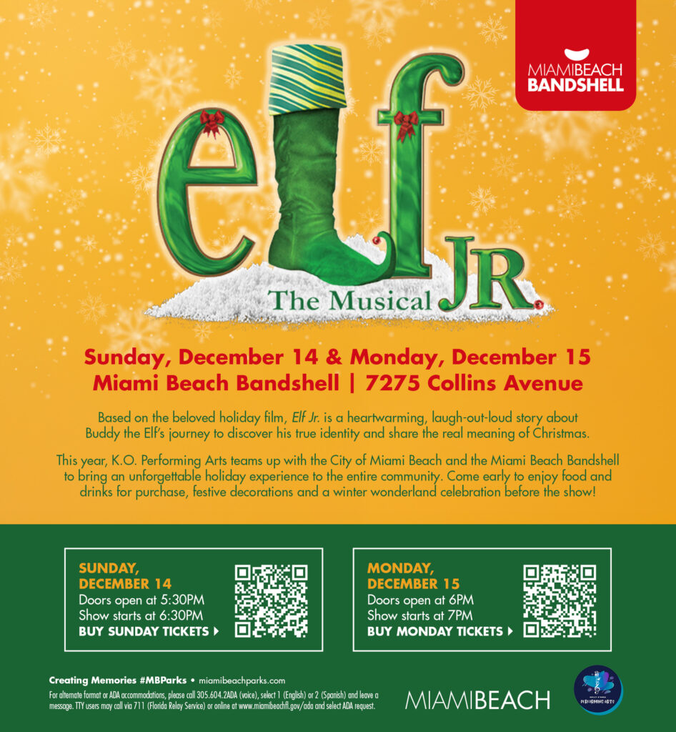 Inspiré du film culte de Noël, Elf. est une histoire touchante et hilarante qui raconte le parcours de Buddy l'elfe à la découverte de sa véritable identité et de la véritable magie de Noël. Cette année, KO Performing Arts s'associe à la Ville de Miami Beach et au Miami Beach Bandshell pour offrir à toute la communauté une expérience inoubliable. Arrivez tôt pour profiter de la restauration (sur place), des décorations festives et d'une ambiance féérique avant le spectacle !