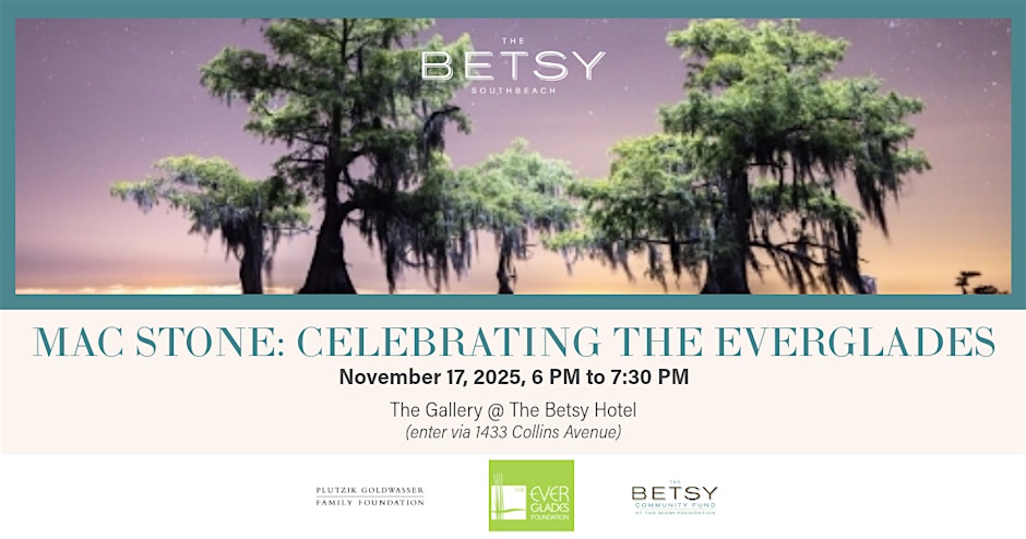 Nov 17 18h00 - 19h30 MAC STONE: CELEBRATING THE EVERGLADES Le Betsy South Beach 1440 Ocean Drive, Miami Beach Détails du Évènement Obtenir l'itinéraire