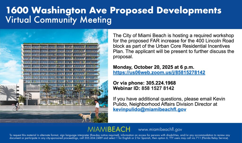 A Prefeitura de Miami Beach está organizando um workshop obrigatório sobre o aumento proposto no FAR para o quarteirão 400 da Lincoln Road, como parte do Plano de Incentivos Residenciais do Núcleo Urbano. O proponente estará presente para discutir a proposta em mais detalhes.