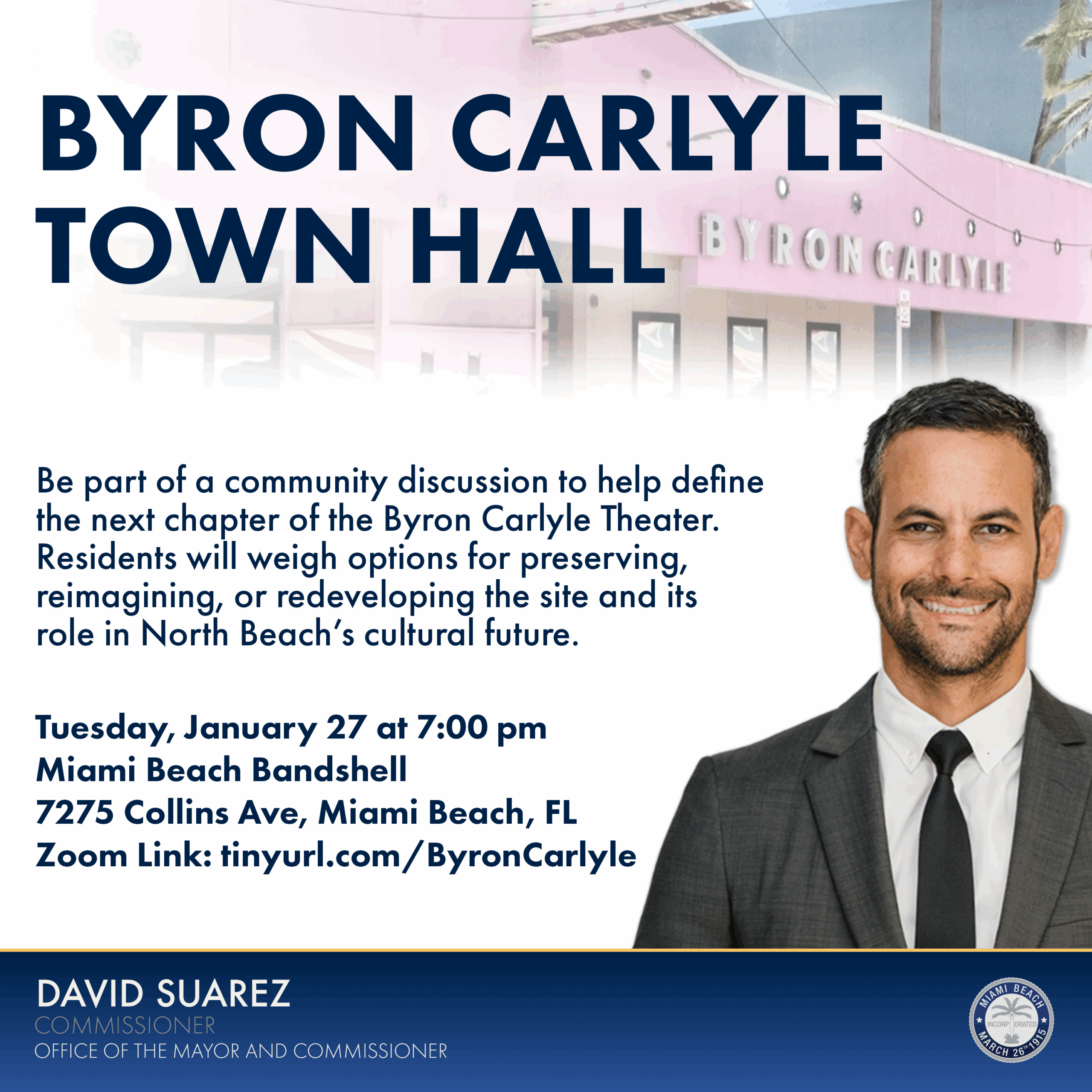 Join Commissioner David Suarez and be part of a community discussion to help define the next chapter of the Byron Carlyle Theater. Residents will weigh options for preserving, reimagining or redeveloping the site and its role in North Beach’s cultural future.