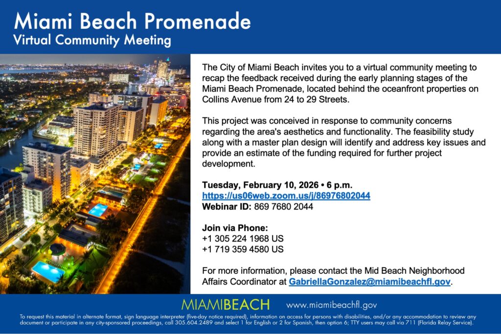 The City of Miami Beach invites you to a virtual community meeting to recap the feedback received during the early planning stages of the Miami Beach Promenade, located behind the oceanfront properties on Collins Avenue from 24 to 29 Streets. This project was conceived in response to community concerns regarding the area’s aesthetics and functionality. The feasibility study along with a master plan design will identify and address key issues and provide an estimate of the funding required for further project development.